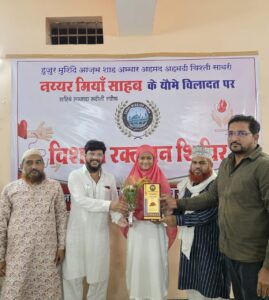 रायगढ़। गत 14 अक्टूबर को हुजूर शाह अम्मार अहमद अहमदी उर्फ नय्यर मियां साहब सज्जादा नशीन दरगाह रुदौली शरीफ के जन्मदिवस के मौके पर बज्मे साबरी रायगढ़ के जानिब से मदरसा गौसुलवरा के बगल मुस्लिम सराय में विशाल रक्तदान शिविर का आयोजन किया गया जिसमें रक्तदाताओं को आयोजन समिति की ओर से हेलमेट गिफ्ट किया गया सुबह 10:00 बजे रक्तदान शिविर शुरू हो चुका था और शाम 4:00 बजे तक 65 लोगों ने रक्तदान किया ।