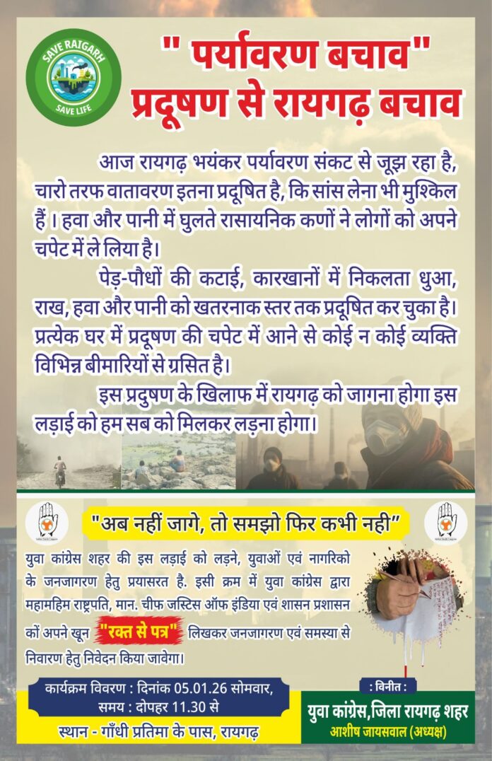 इस बढ़ते प्रदूषण के खिलाफ रायगढ़ को जगाने के लिए युवा कांग्रेस ने निर्णायक कदम उठाने का ऐलान किया है। जनजागरण के तहत युवा कांग्रेस कार्यकर्ता एवं नागरिक महामहिम राष्ट्रपति, माननीय चीफ जस्टिस ऑफ इंडिया तथा शासन-प्रशासन को अपने रक्त से पत्र लिखकर पर्यावरणीय संकट की गंभीरता से अवगत कराएंगे। यह प्रतीकात्मक लेकिन बेहद संवेदनशील कदम प्रशासन को झकझोरने और समस्या के स्थायी समाधान की मांग को मजबूती देगा।
